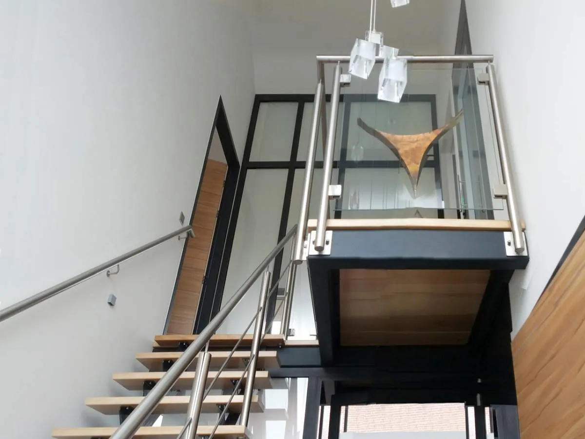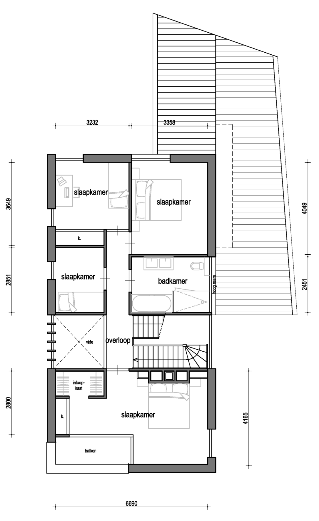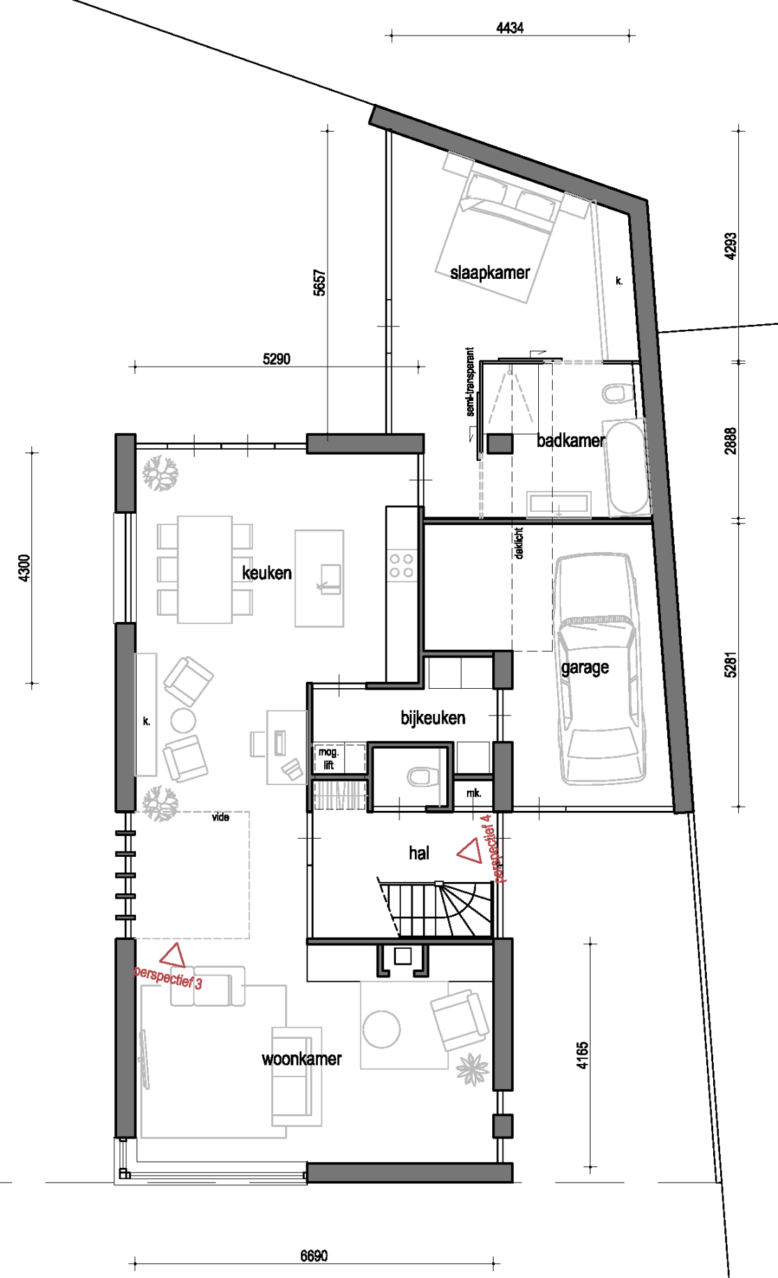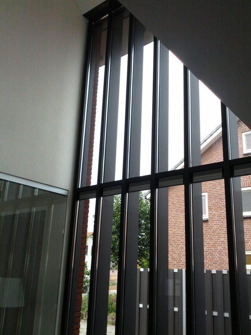 In het midden van de woning is een verticale ‘dwars-snede’ aangebracht. Hierdoor zijn als het ware twee woning-volumes gecreëerd (onder een doorlopend dak), die In de hal verbonden worden door een ‘brug’ waarop de vrijhangende trap aansluit. Deze ruimtelijk dynamiek komt ook tot uiting in de overhangende dakrand boven de loggia in de voorgevel.