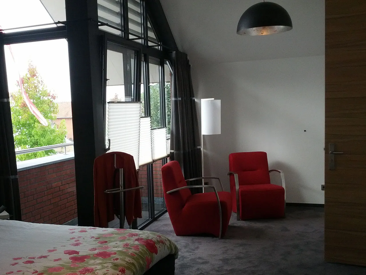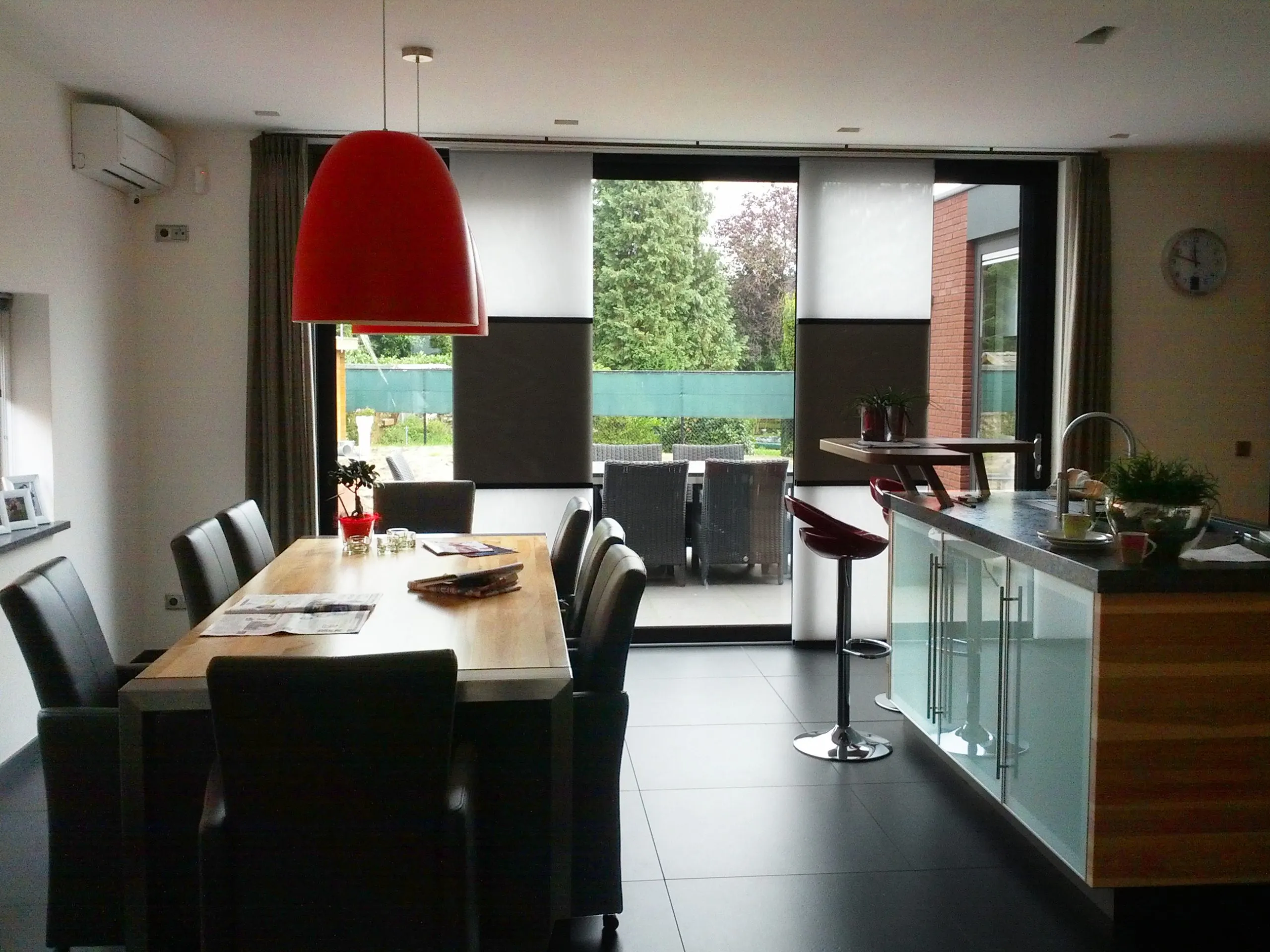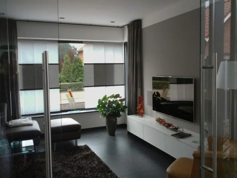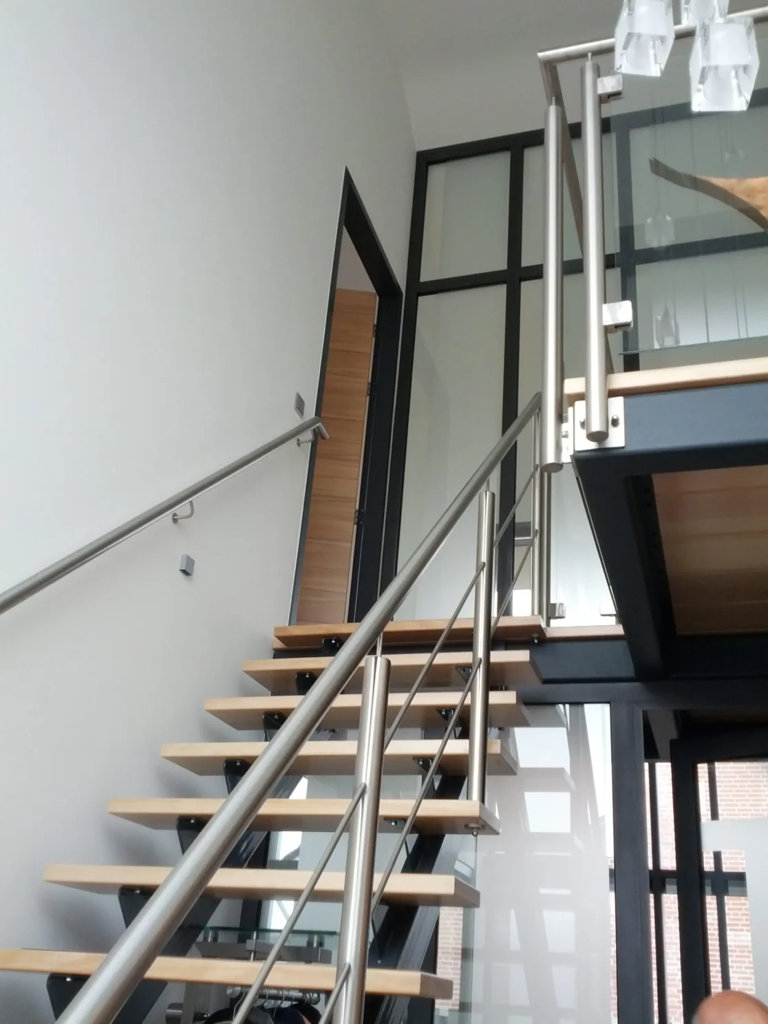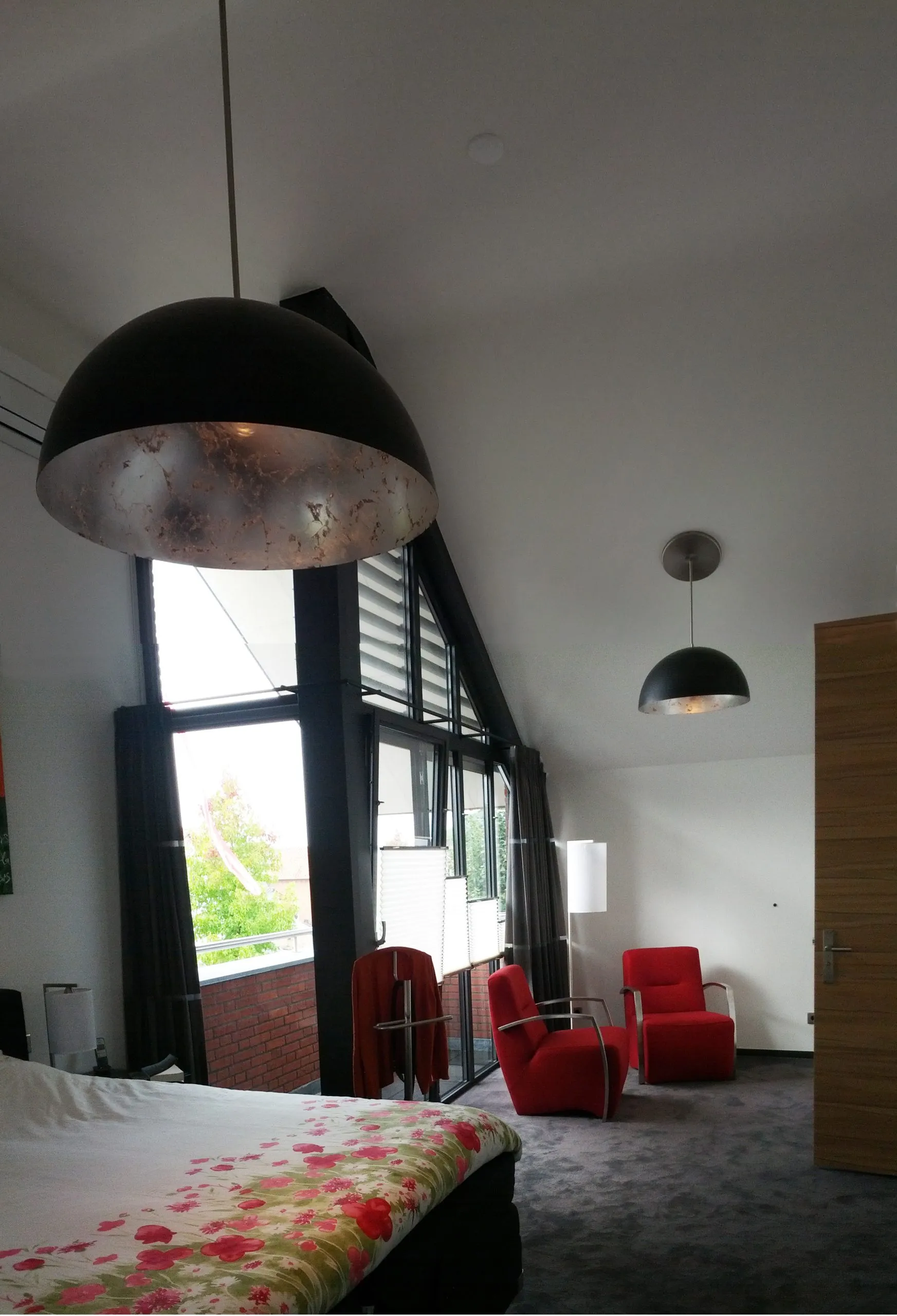 In het midden van de woning is een verticale ‘dwars-snede’ aangebracht. Hierdoor zijn als het ware twee woning-volumes gecreëerd (onder een doorlopend dak), die In de hal verbonden worden door een ‘brug’ waarop de vrijhangende trap aansluit. Deze ruimtelijk dynamiek komt ook tot uiting in de overhangende dakrand boven de loggia in de voorgevel.
