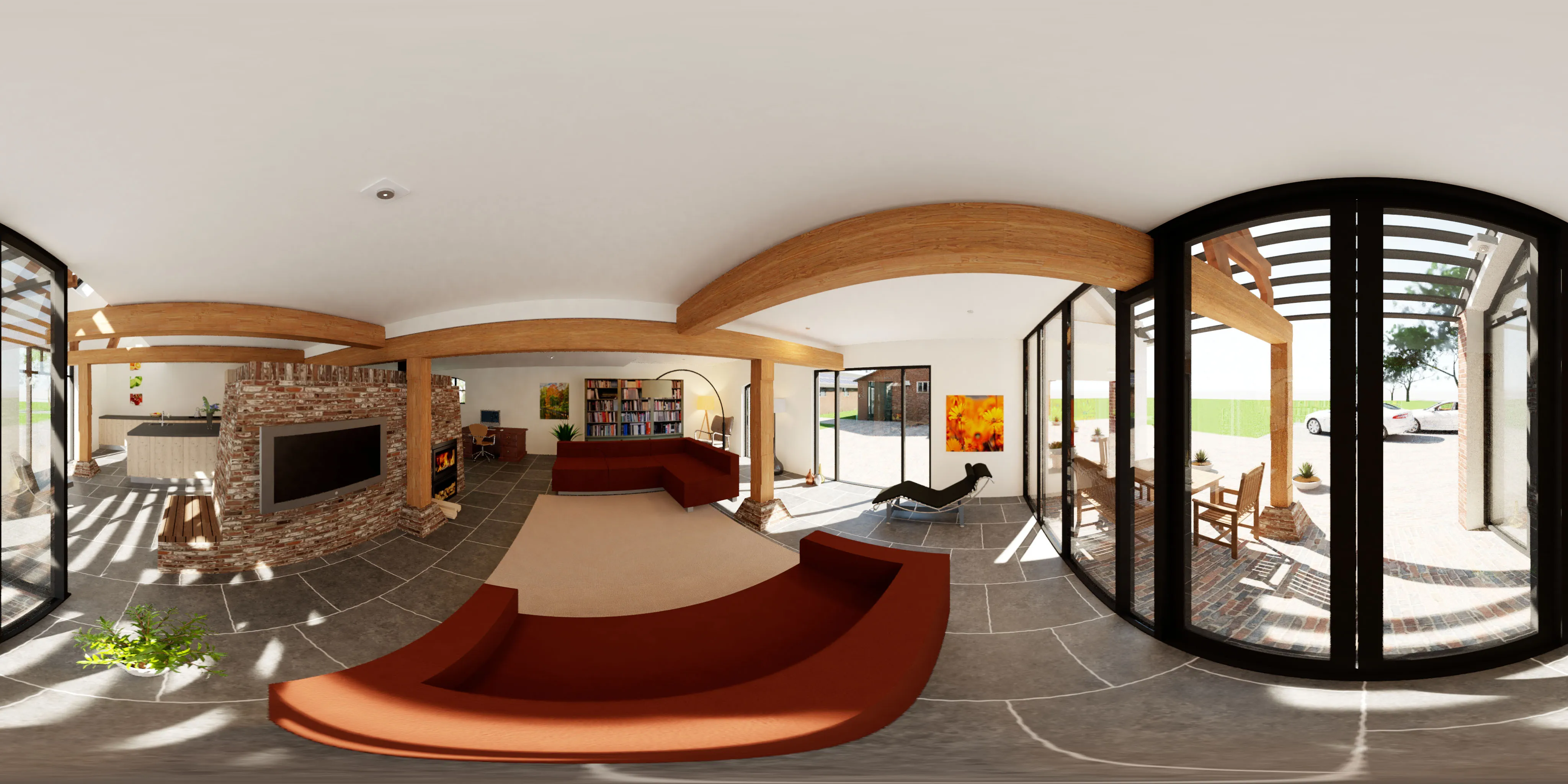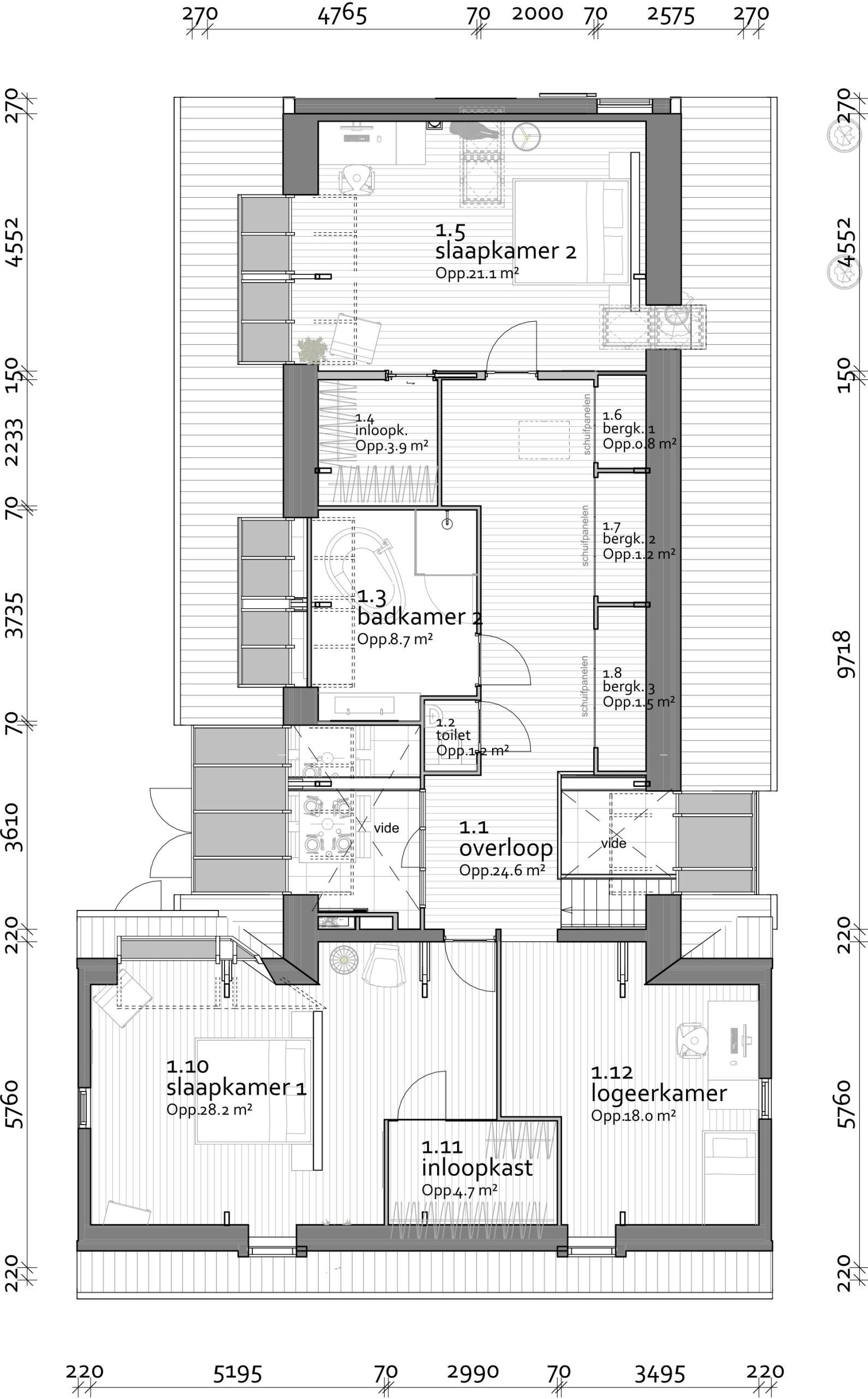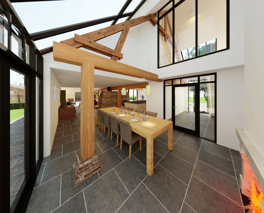 Van deze boerderij stonden oorspronkelijk alleen de gevels en de daken overeind. Deze ‘cart blanche’ maakte het mogelijk om grote ingrepen te introduceren, zoals diverse vides en ruimtelijke doorkijkjes tussen de twee bouwlagen en een spectaculair overkragend zonnedak tbv. het buitenterras.