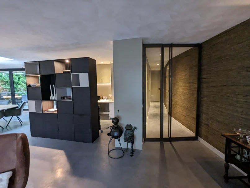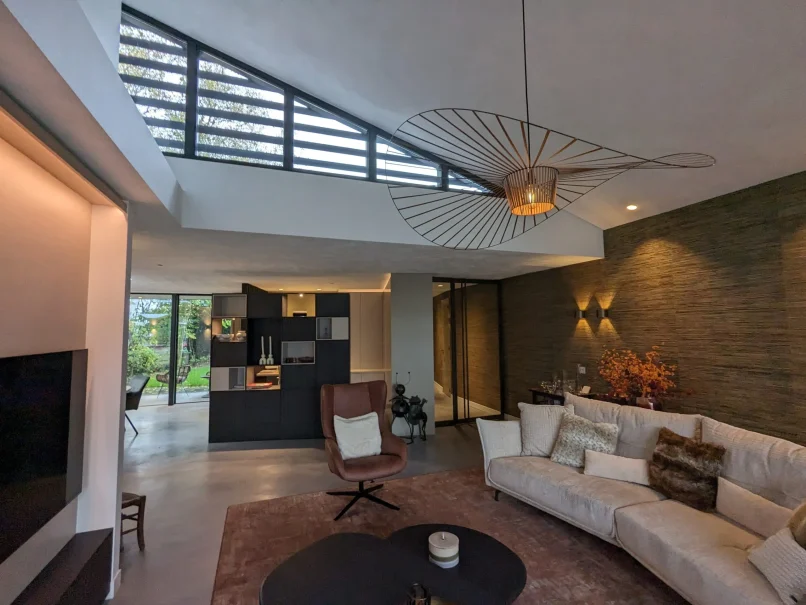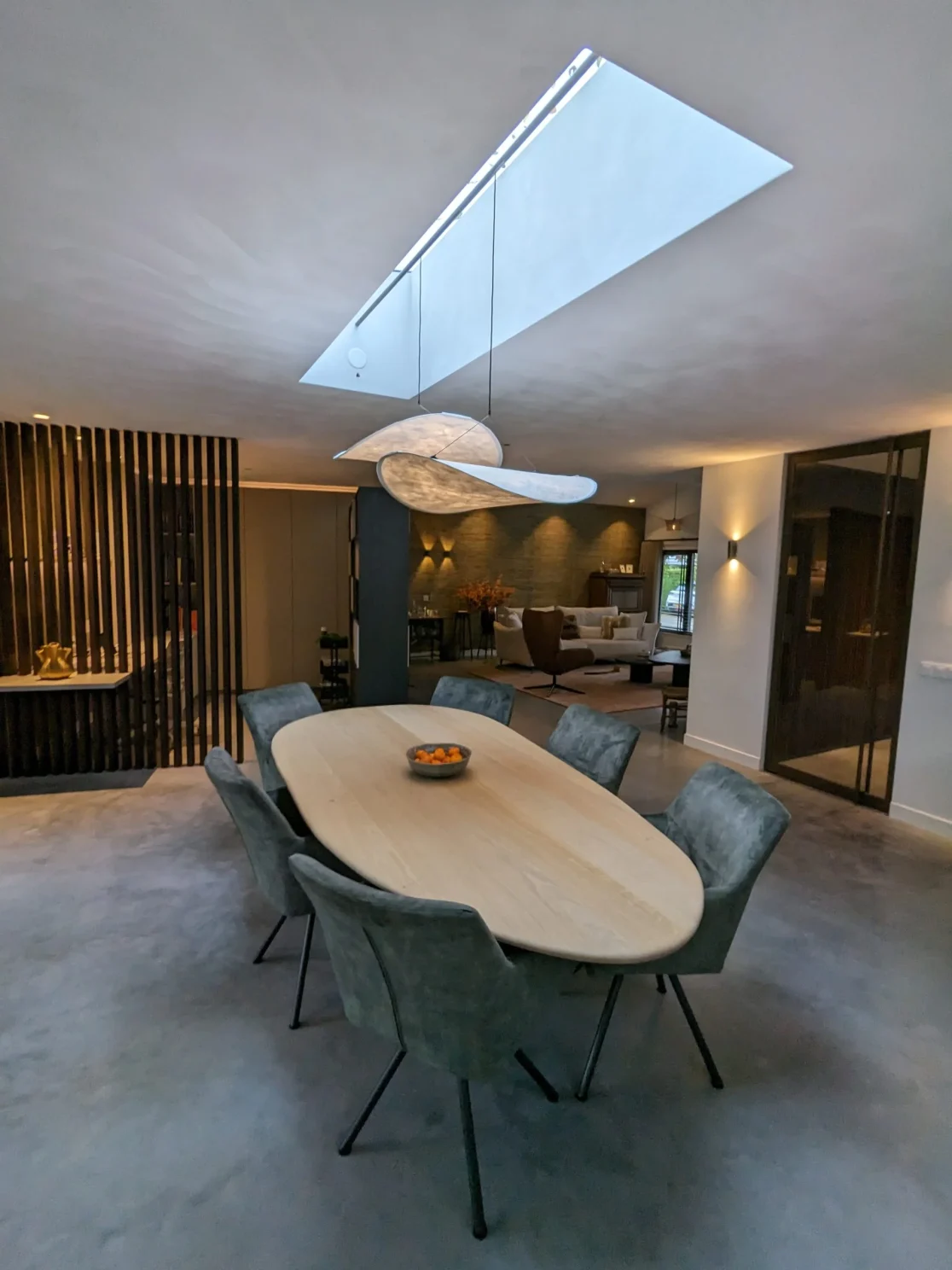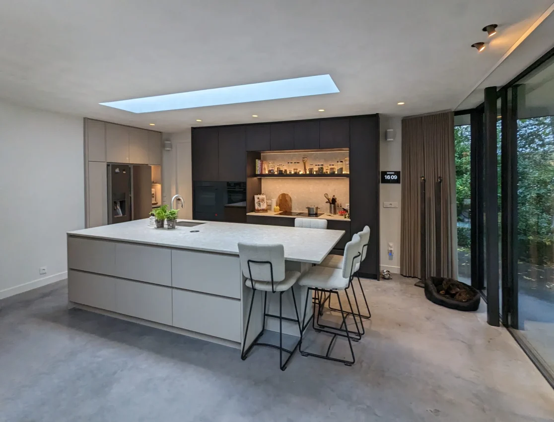 Ook het comfort, het daglicht en de ruimtelijke ervaring zijn sterk verbeterd door de ruimtes in elkaar door te laten lopen, wat nog eens versterkt wordt door nieuwe vloer (met vloerverwarming) die zelfs visueel doorloopt naar het terras.