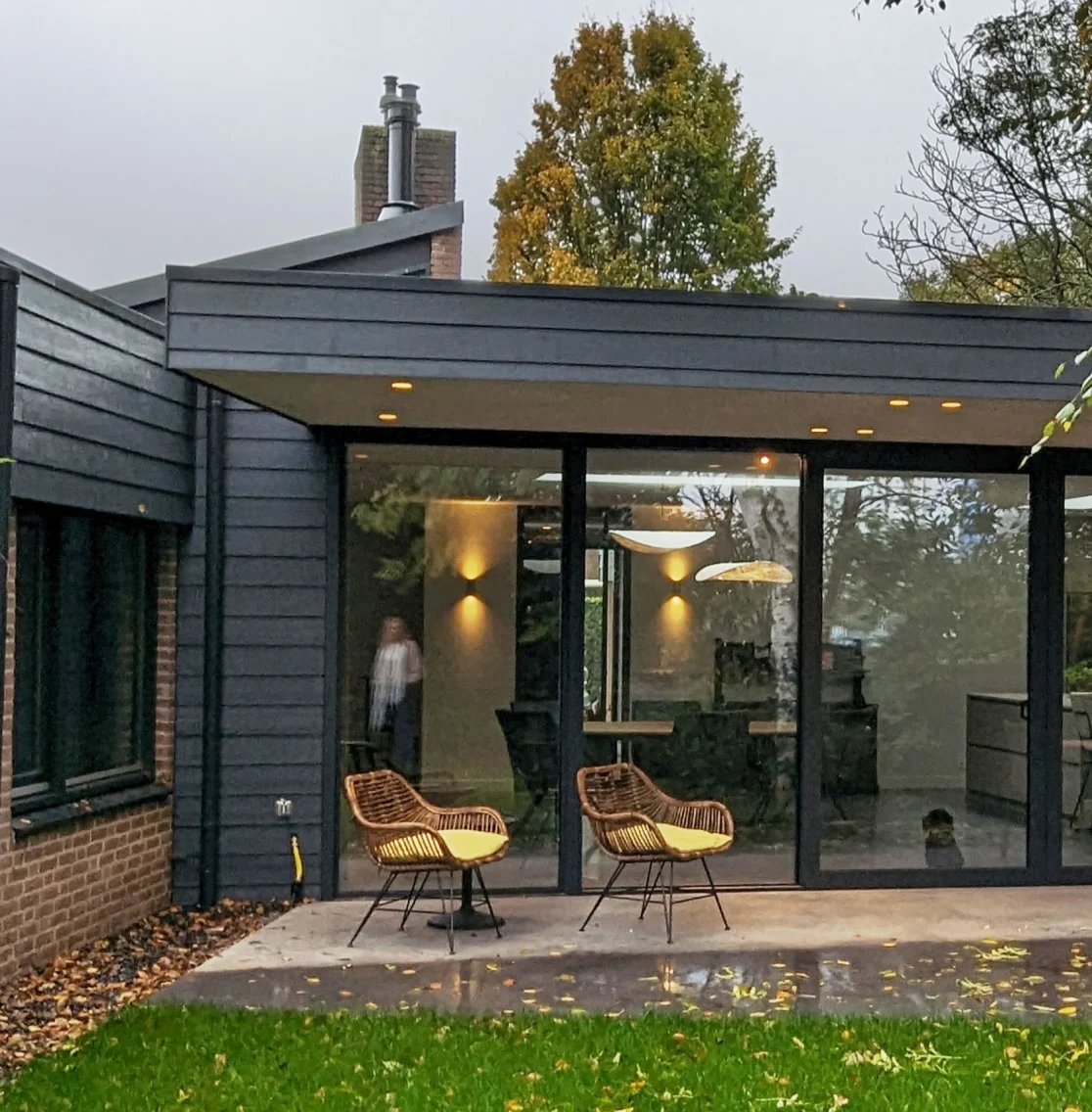 Deze jaren ’70 woning was door de jaren heen meerdere keren verbouwd waardoor de eenheid wat op de achtergrond was beland. Door de integrale aanpak van de gevel, in combinatie met de toevoeging van schuifpui, luifel en daklichten, is de woning voorzien van een eigentijdse aanblik.